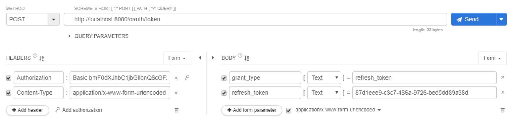 POST /oauth/tokenBASIC authentication(Authorization)헤더- client Id(myApp) + client secret(pass)