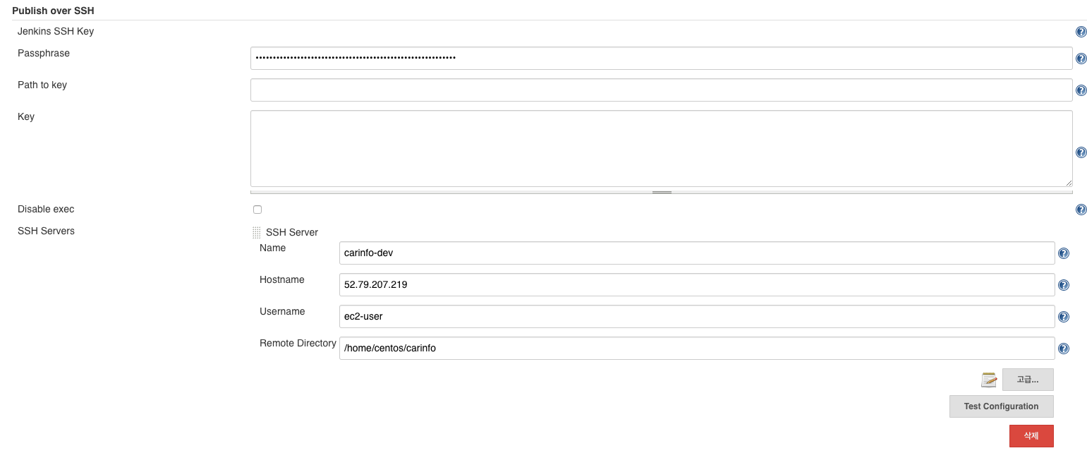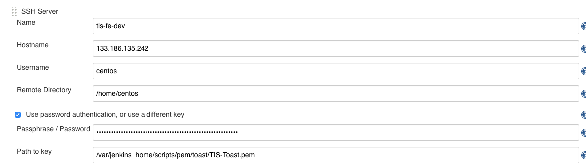 TOAST:/var/jenkins_home/scripts/pem/toast/ - 저장 버튼을 클릭해 입력한 SSH Server 정보 저장