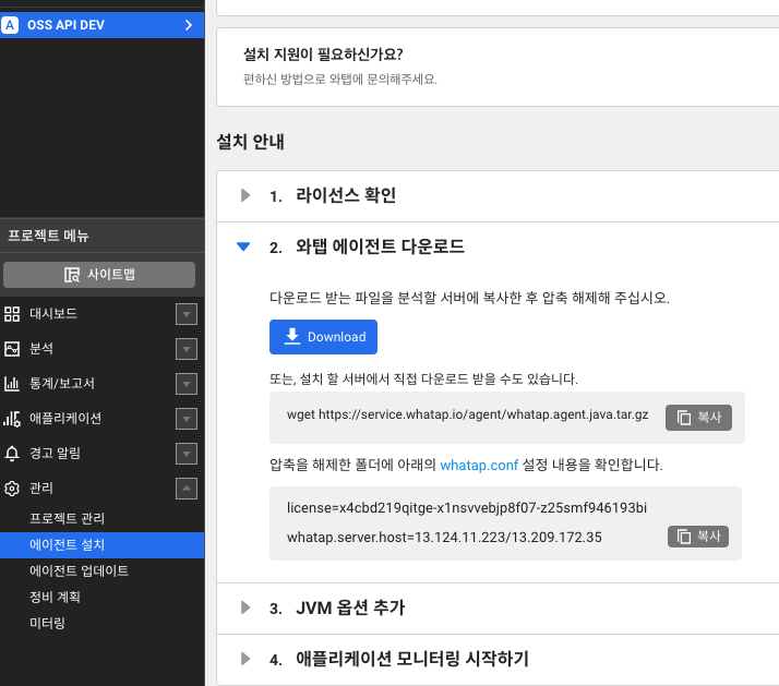 ## WHATAP 해당 프로젝트 > 관리 > 에이전트 설치 > 2. 와탭 에이전트 다운로드 참조