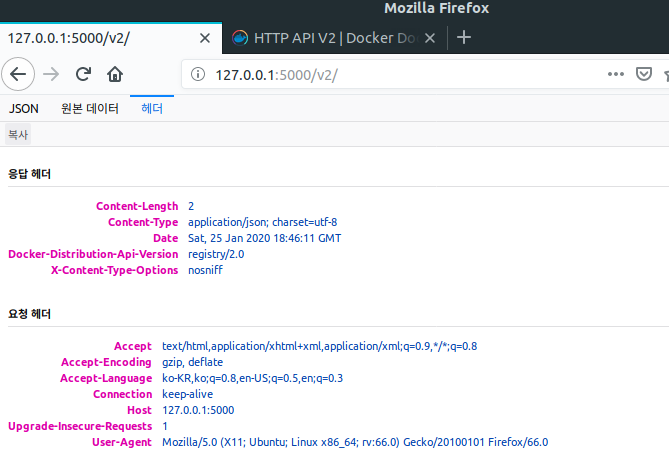 브라우저를 켜서 127.0.0.1:5000/v2/ 서비스 접속 가능한지 확인
