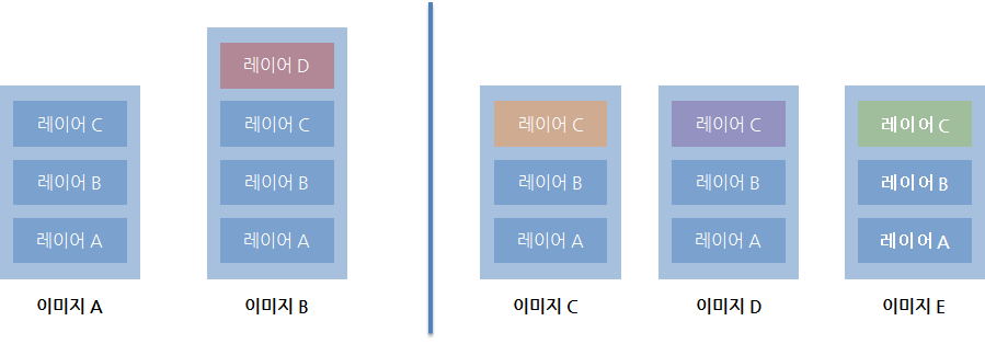 왼쪽: 이미지 A를 지운다 하더라도 이미지 B에서 레이어 A, B, C를 사용하고 있기 때문에 지워지지 않음