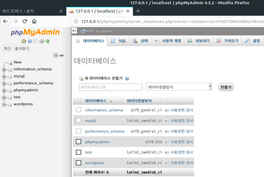 127.0.0.1/phpmyadmin으로 접속해서 wordpress 데이터베이스 생성한다