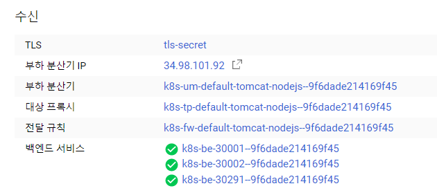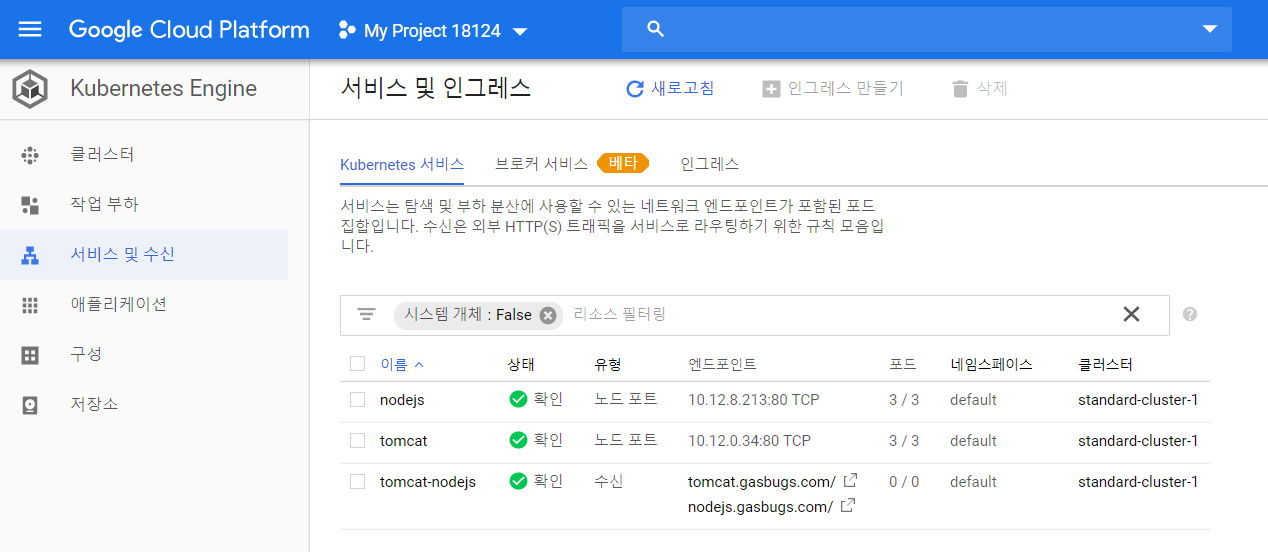 쿠버네티스 엔진에서 서비스 및 수신을 클릭하고 각각의 서비스가 잘 동작하는 지 확인한다