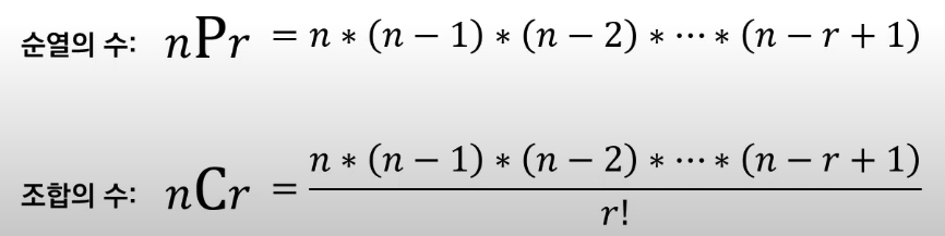 조합: 서로 다른 𝑛개에서 순서에 상관 없이 서로 다른 𝑟개를 선택하는 것