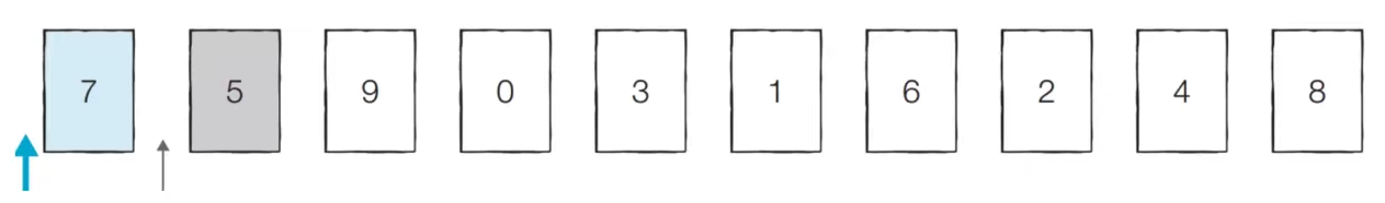 - [Step 0] 첫 번째 데이터 '7'은 그 자체로 정렬이 되어 있다고 판단하고, 두 번째 데이터인 '5'가 어떤 위치로
