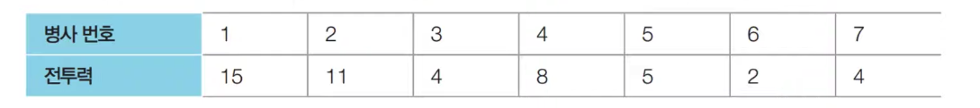 예를 들어, N = 7일 때 나열된 병사들의 전투력이 다음과 같다고 가정한다
