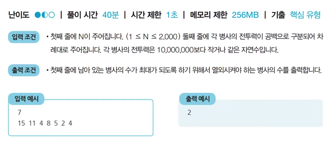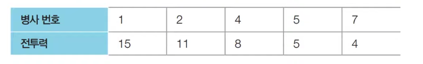 - 병사에 대한 정보가 주어졌을 때, 남아 있는 병사의 수가 최대가 되도록 하기 위해서 열외시켜야 하는 병사의 수를