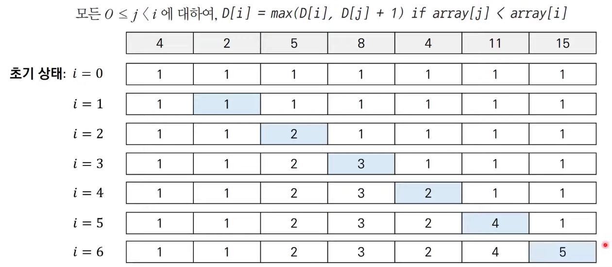 - 이 수열의 가장 긴 증가하는 부분 수열은 {4,5,8,11,15}이다