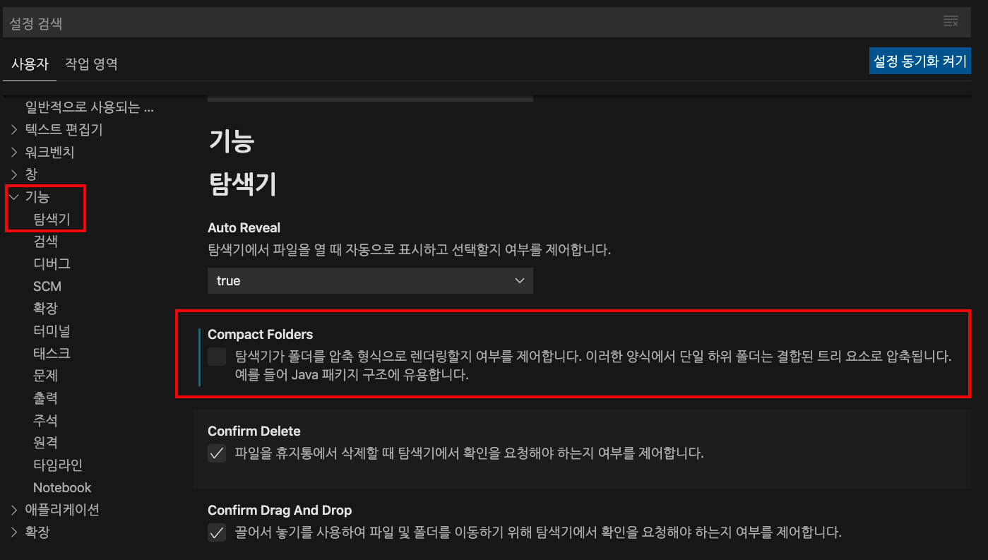 위와 같이 Compact Folders 옵션의 체크박스를 해제 하면 기존과 같이 폴더가 펼쳐져서 보이게 된다