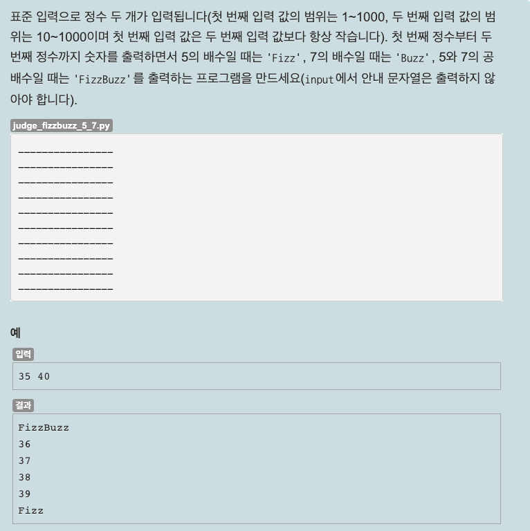 print('Fizz' * (i % 5 == 0) + 'Buzz' * (i % 7 == 0) or i)728x90