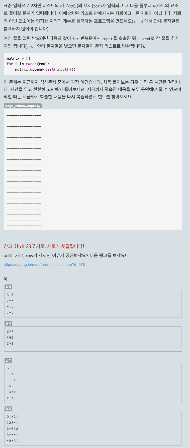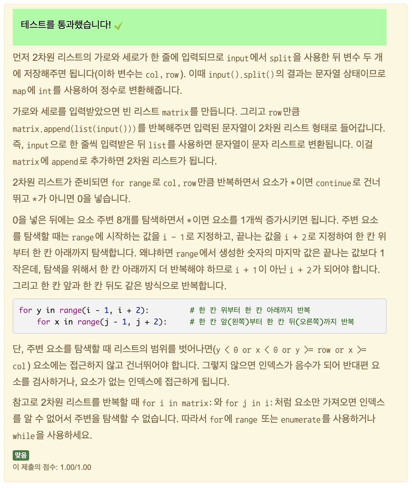 matrix[i][j] = 0 # 0을 넣은 뒤에는 요소 주변 8개를 탐색하면서 *이면 요소를 1개씩 증가