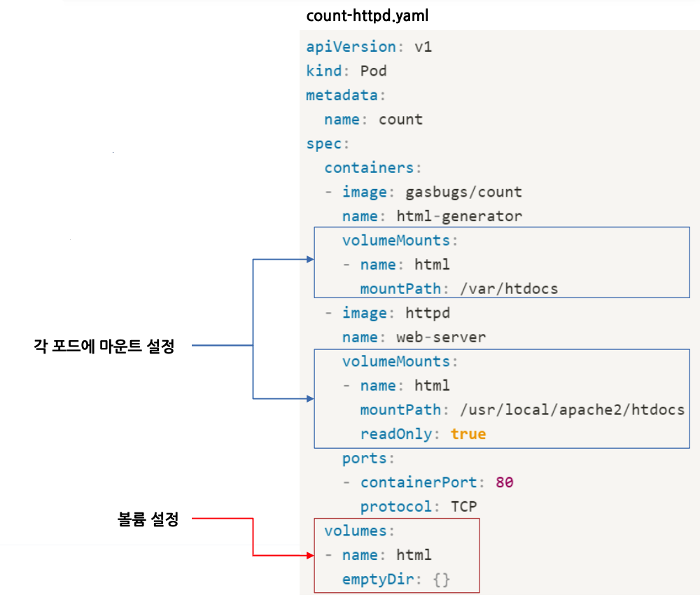 - 임시 볼륨: 포드가 사라지면 함께 파괴되는 임시 볼륨 포드 내부에서만 컨테이너와 공유하기 위해서 사용