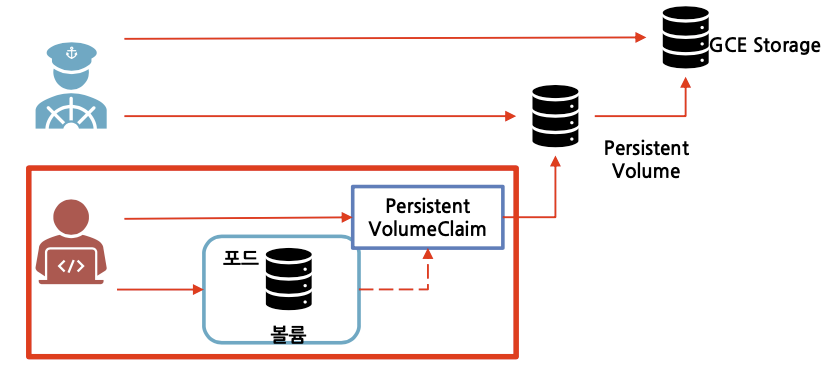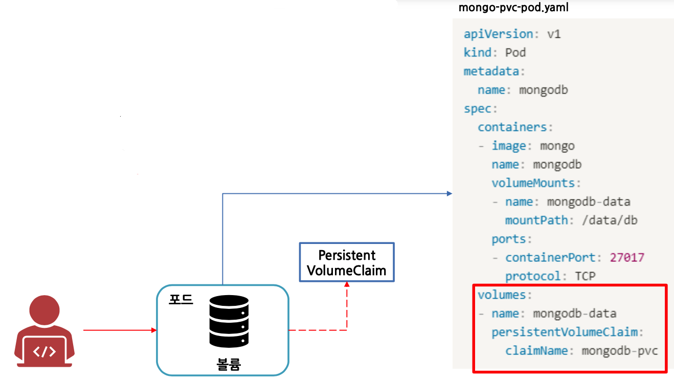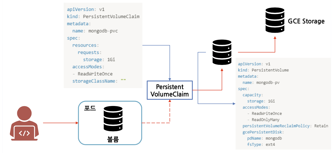 persistentVolumeClaim: 사용자가 특정 클라우드 환경의 세부 사항을 모른 채 GCE PersistentDisk 또는 iSCSI 볼륨과 같은 내구성 스토리지를 요구(Claim)할 수 있는 방법