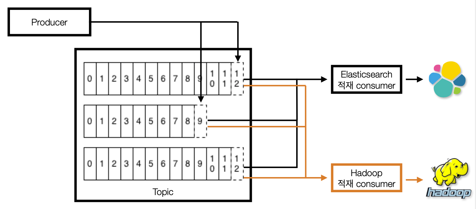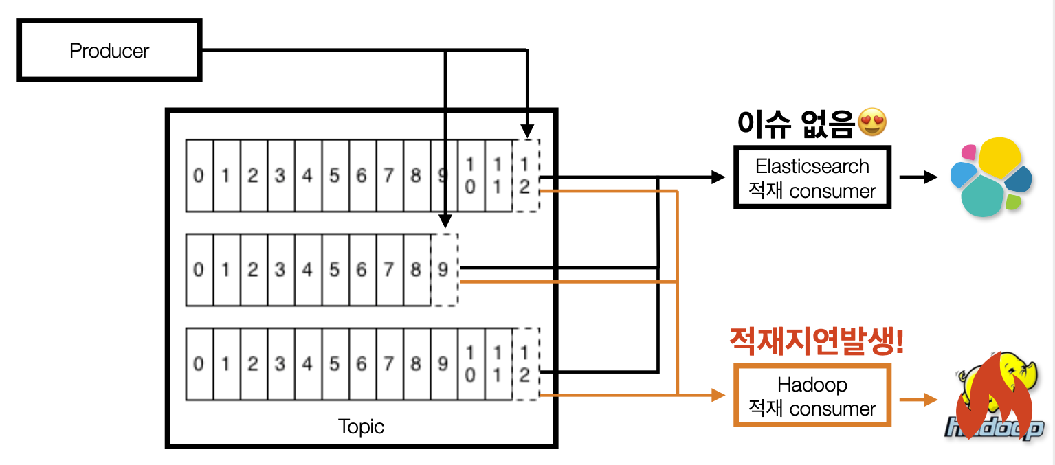 - 하둡에 이슈가 발생하여 컨슈머의 적재지연이 발생하더라도 엘라스틱서치에 적재하는 컨슈머의 동작에는 이슈가 없음