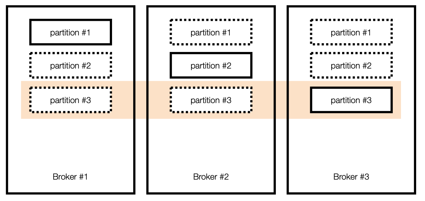 - 파티션 3개, 레플리케이션이 3개로 이루어진 토픽이 브로커에 할당된 모습