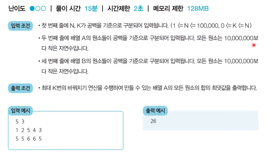 동빈이는 최대 K 번의 바꿔치기 연산을 수행할 수 있는데, 바꿔치기 연산이란 배열 A에 있는 원소 하나와