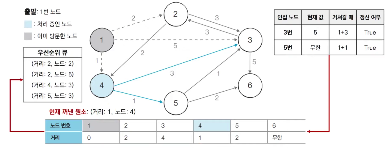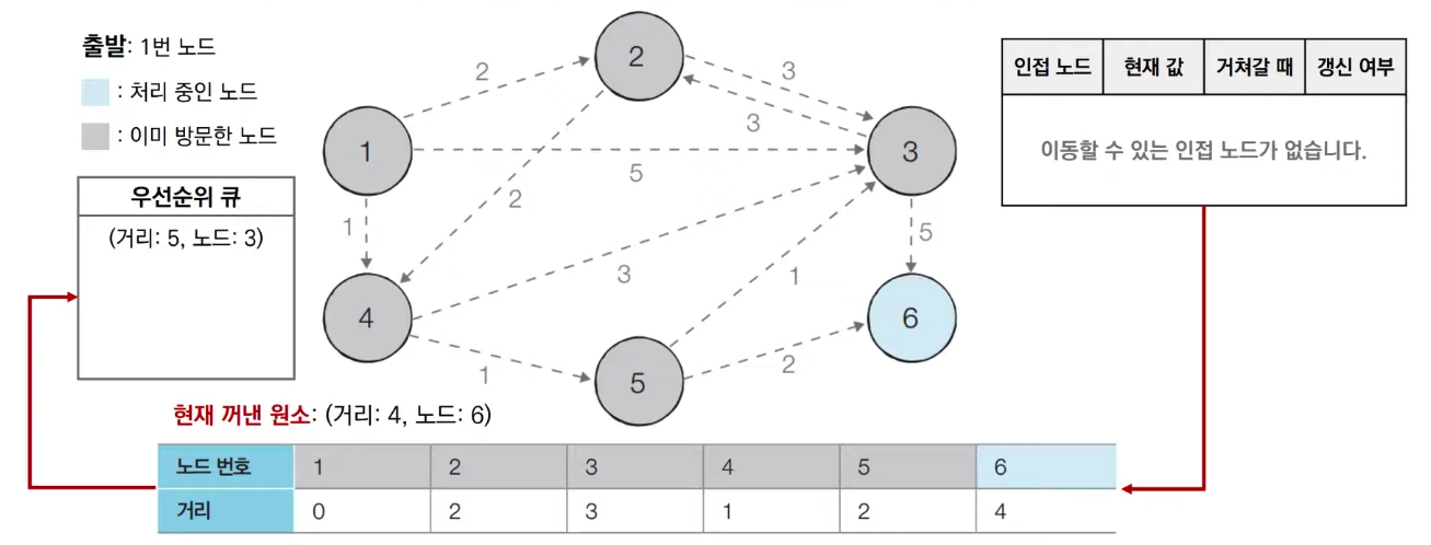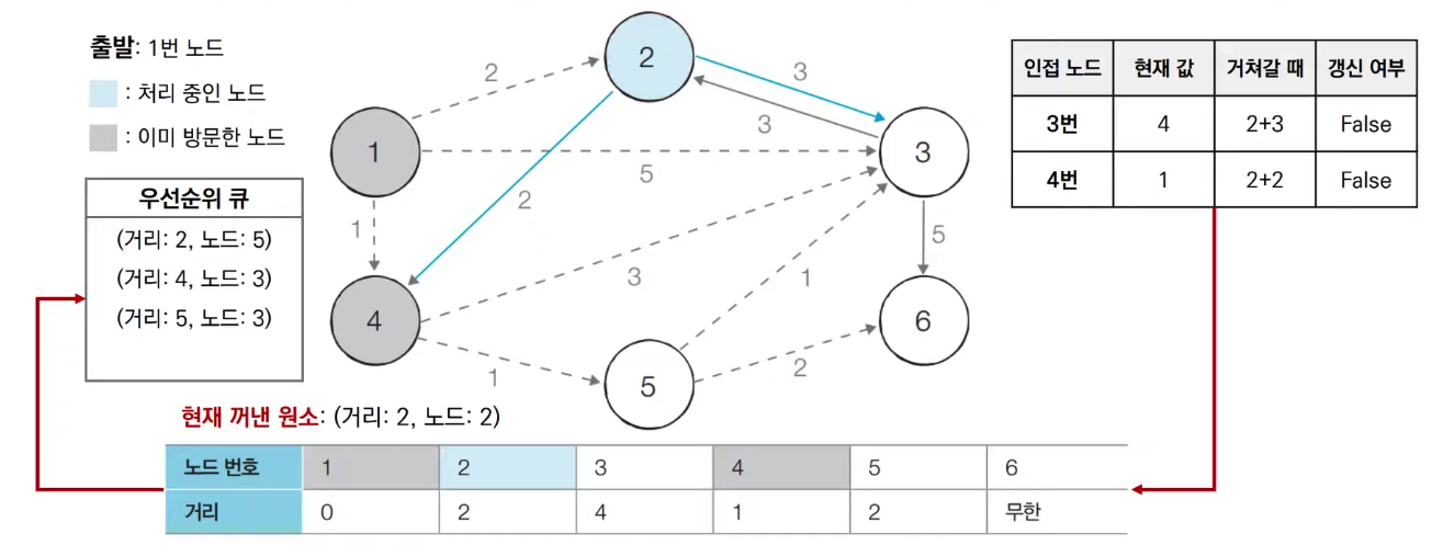 - [Step 6] 우선순위 큐에서 원소를 꺼낸다 3번 노드는 이미 방문했으므로 무시한다