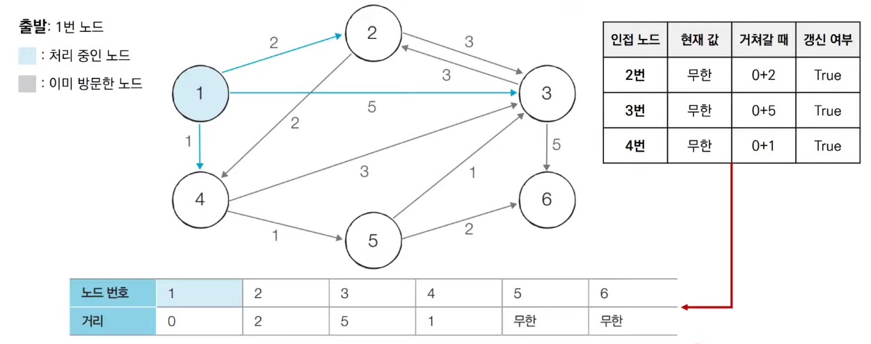 - 방문하지 않은 노드 중에서 최단 거리가 가장 짧은 노드를 선택한다