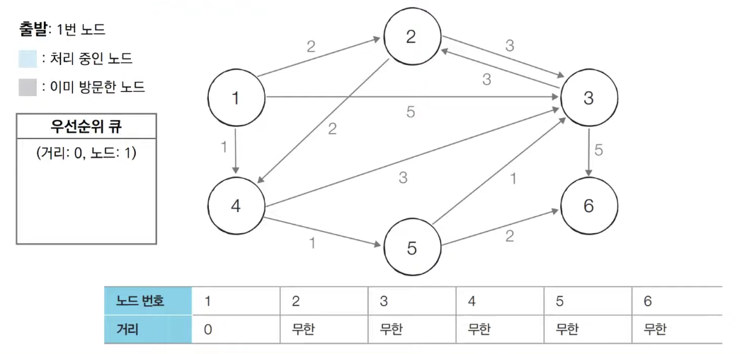 - [초기 상태] 그래프를 준비하고 출발 노드를 설정하여 우선순위 큐에 삽입한다