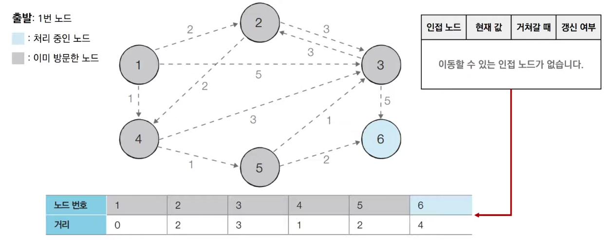 - [Step 6] 방문하지 않은 노드 중에서 최단 거리가 가장 짧은 노드인 6번 노드를 처리한다