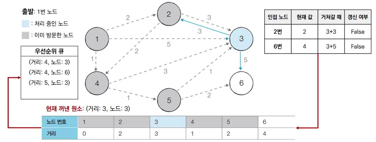 - [Step 5] 우선순위 큐에서 원소를 꺼낸다 3번 노드는 아직 방문하지 않았으므로 이를 처리한다
