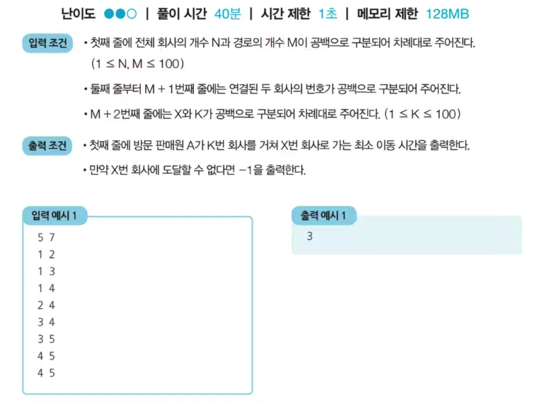 - 미래 도시에는 1번부터 N번까지의 회사가 있는데 특정 회사끼리는 서로 도로를 통해 연결되어 있다. 방문 판매원