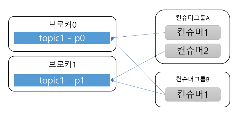 - 한 개 파티션을 서로 다른 그룹의 컨슈머는 공유할 수 있음
