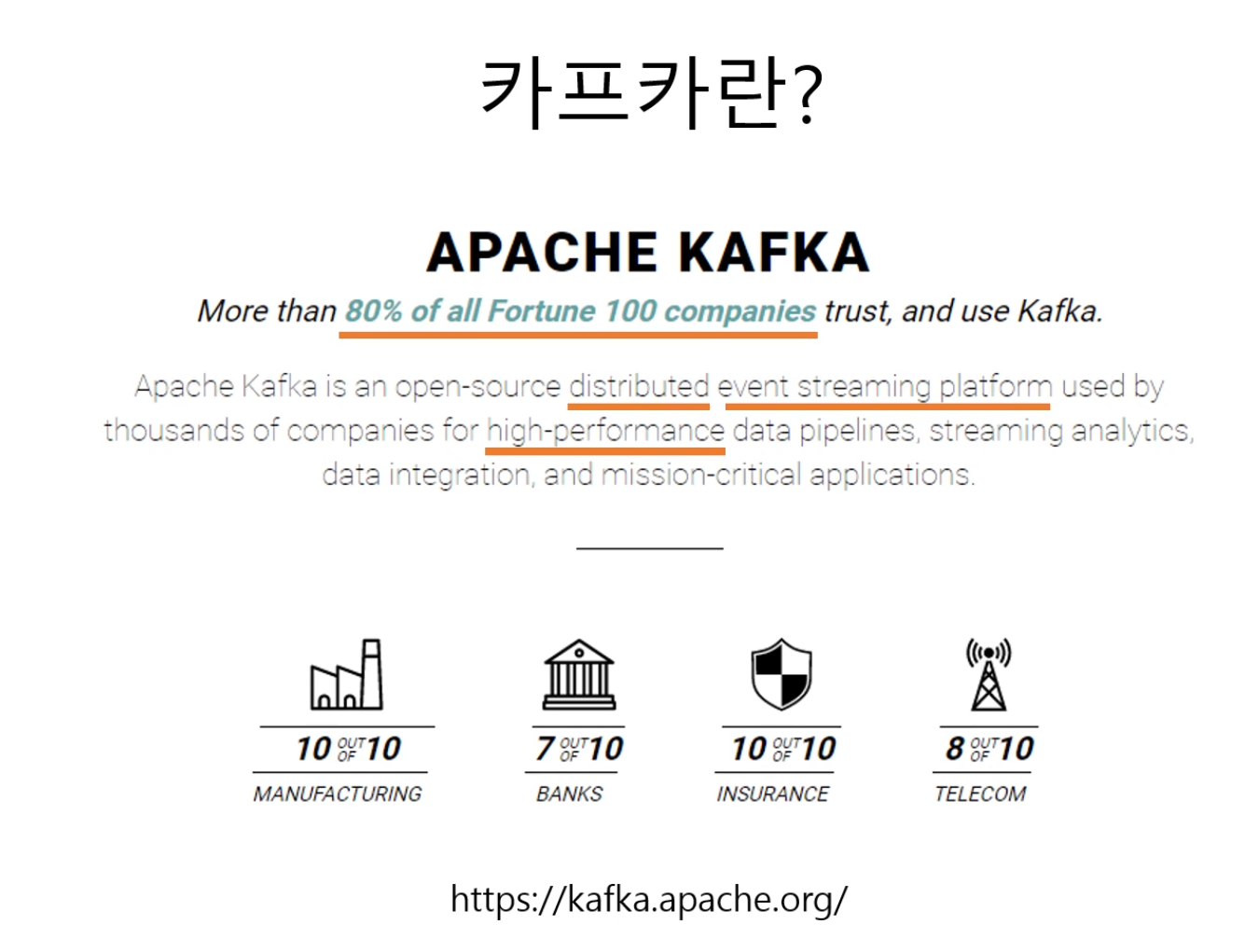 Fortune 100개 기업 기준으로 80%이상이 kafka 를 사용하고 있음