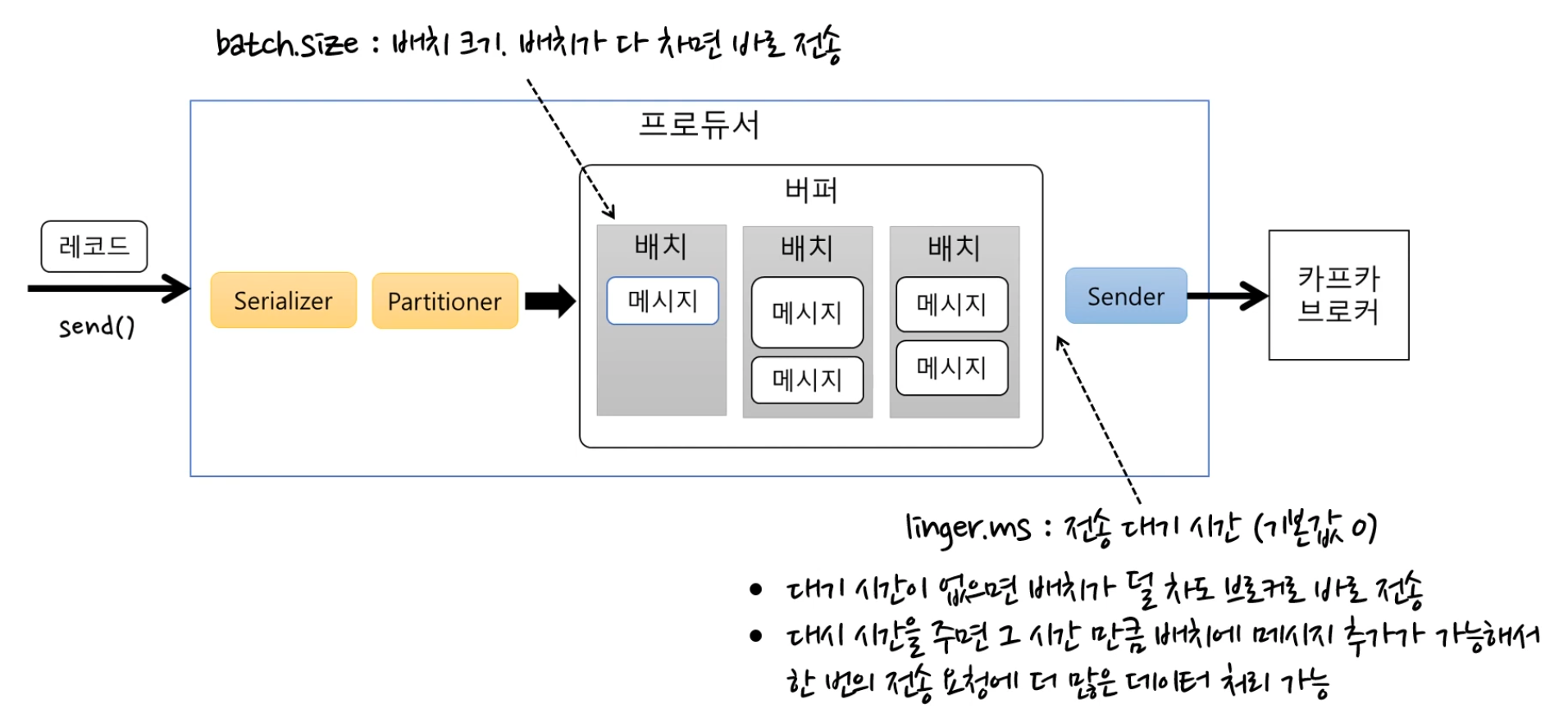 : 배치 크기, 배치가 다 차면 바로 전송linger.ms