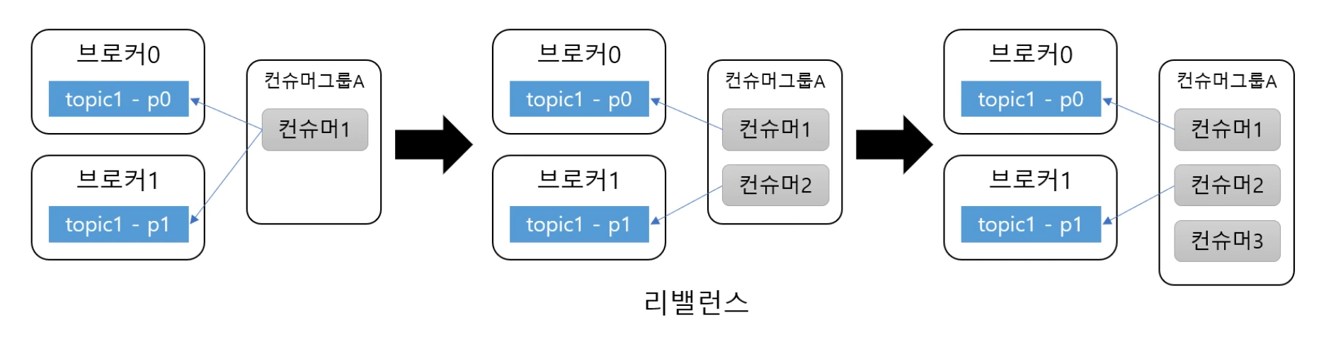 - 브로커는 일정 시간 컨슈머로부터 하트비트(heartbeat)가 없으면 컨슈머를 그룹에서 빼고 리밸런스 진행