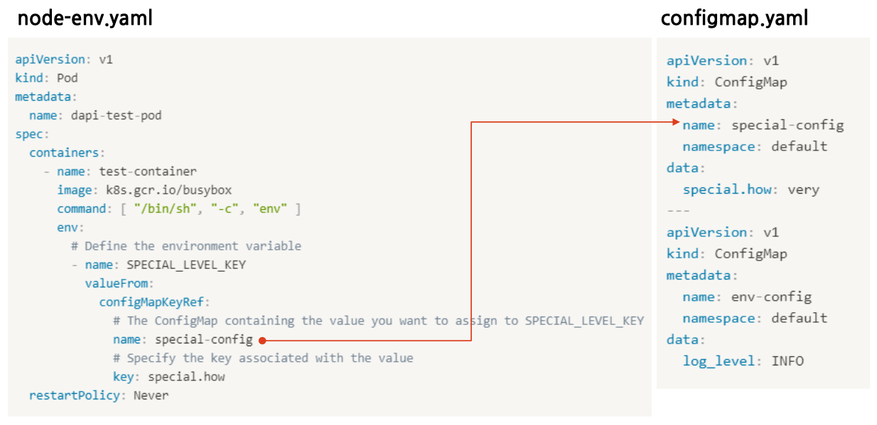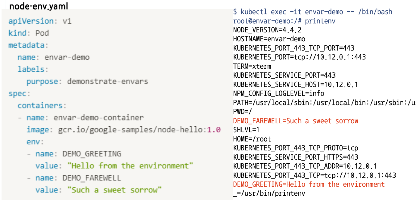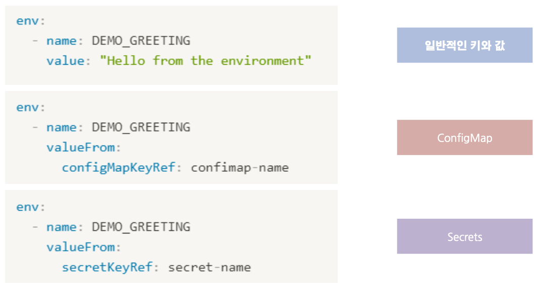 - 쿠버네티스의 환경 변수는 YAML 파일이나 다른 리소스로 전달