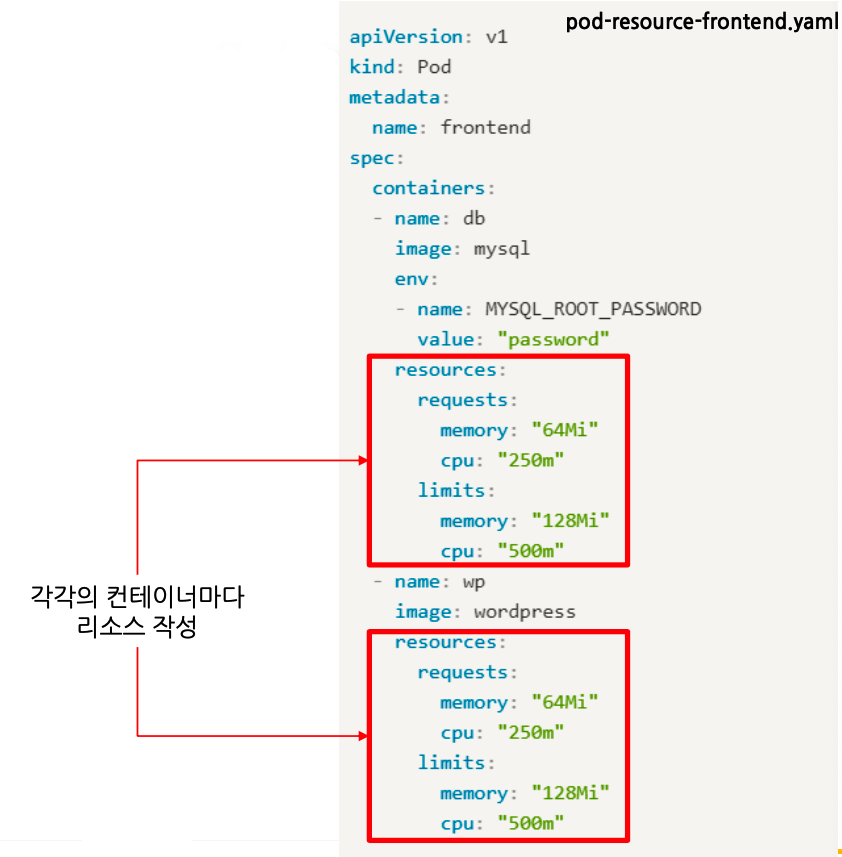 - 모든 컨테이너에는 CPU, 메모리에 대한 최소요구사항 및 제한 설정이 필요