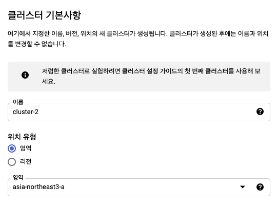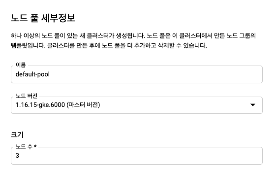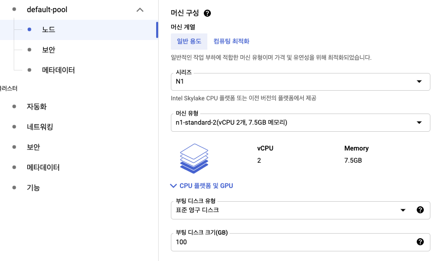 - 노드: 일반용도 N1 n1-standard-2(vCPU 2ro, 7.5GB 메모리 선택)