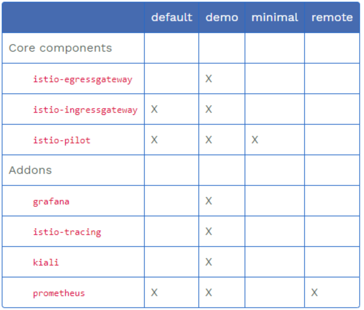 Istio를 설치할 때 원하는 프로파일을 지정하여 원하는 구성의 istio를 설치할 수 있다
