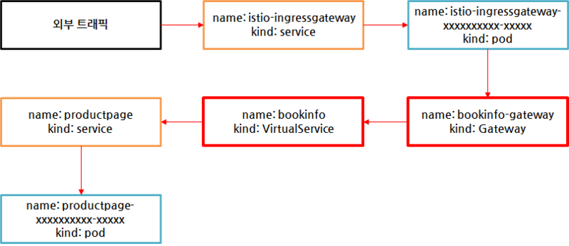 외부 트래픽은 istio-ingress로부터 들어와서 게이트웨이를 통해 실제 서비스하는 포드로 연결된다