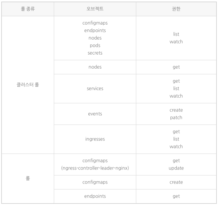 nginx-ingress-serviceaccount 는 다음과 같은 권한을 갖는다