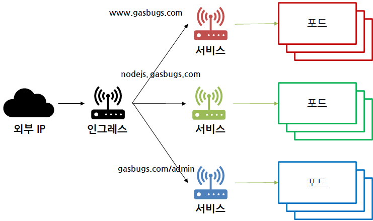 클라우드에서 인그레스를 생성하면 외부에 게이트웨이를 생성하고 각 기능에 맞게 서비스에 연결한다