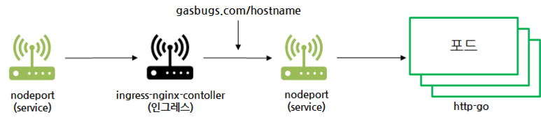 도메인과 경로로 규칙을 지정하는데 여기서는 gasbugs.com/hostsname로 ingress에 요청이 들어오면 http-go로 연결해준다