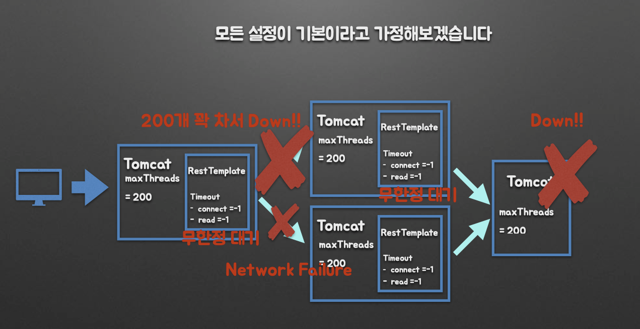 - 특정 메소드에서의 지연 (주로 외부 연동에서의 지연)이 시스템 전체의 Resource 를 (Thread, Memory등)를 모두 소모하여 시스템 전체의 장애를 유발한다