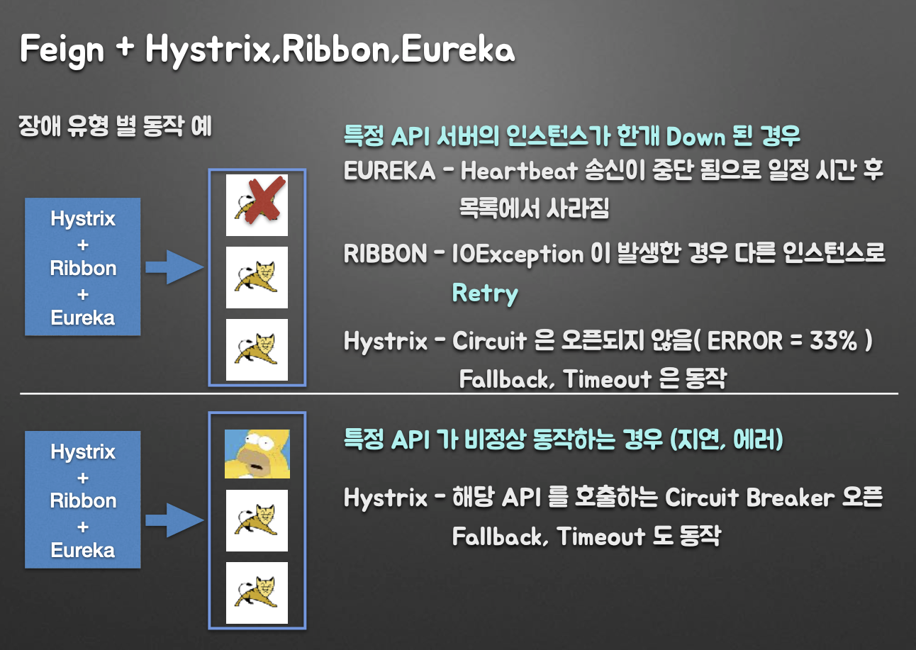 - Hystrix - 해당 API 를 호출하는 Circuit Breaker 오픈 Fallback, Timeout 도 동작