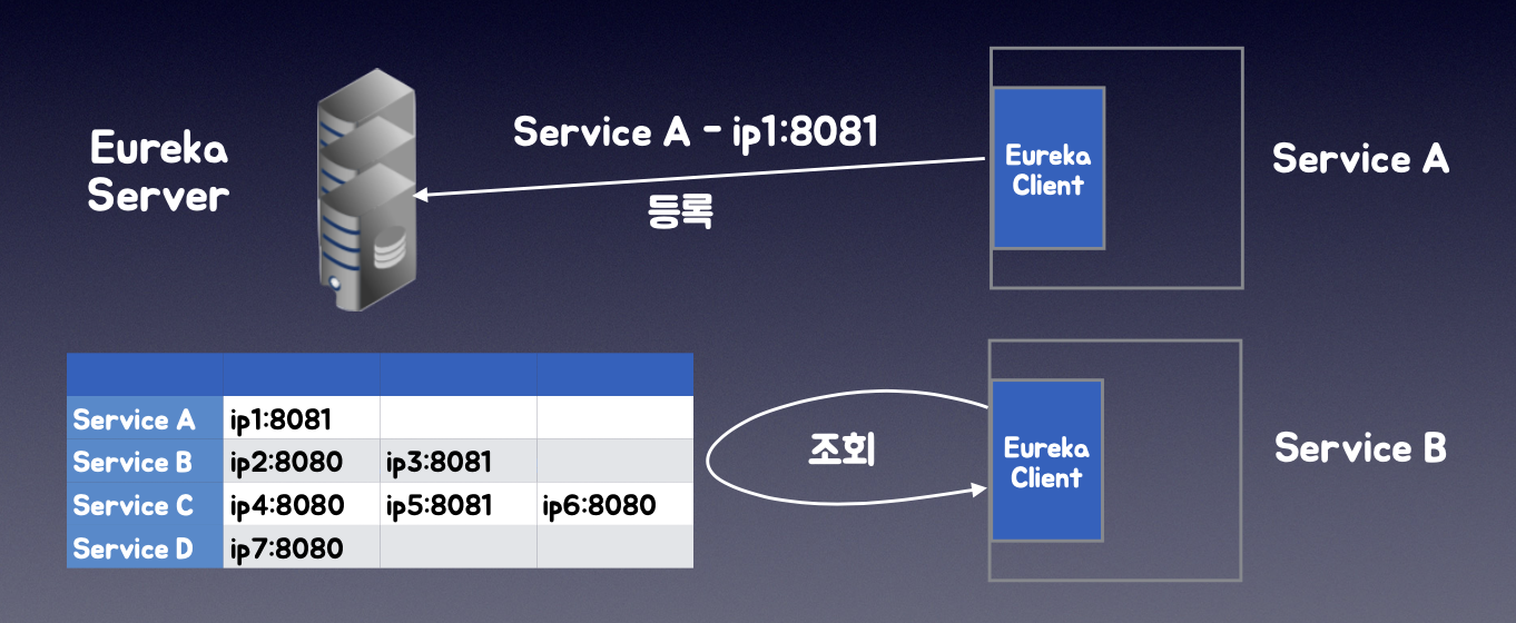 - 등록: 서버가 자신의 서비스 이름(종류)와 IP주소 포트를 등록