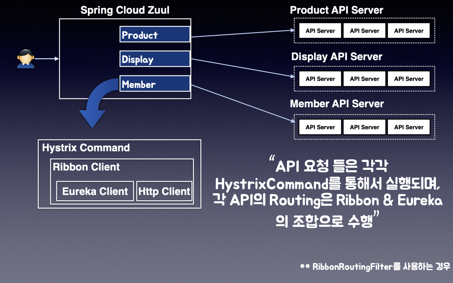 Spring Cloud Zuul은 API Routing을 Hystrix, Ribbon, Eureka를 통해서 구현