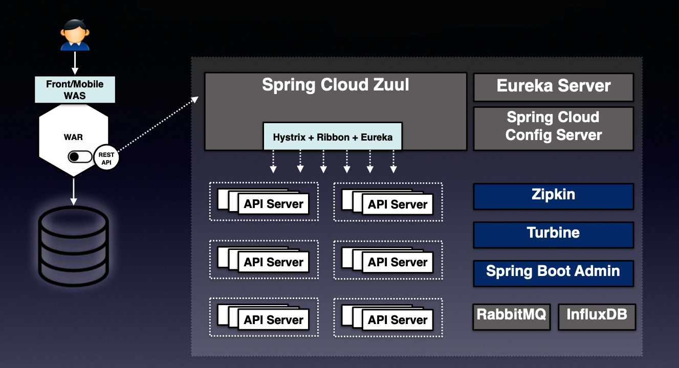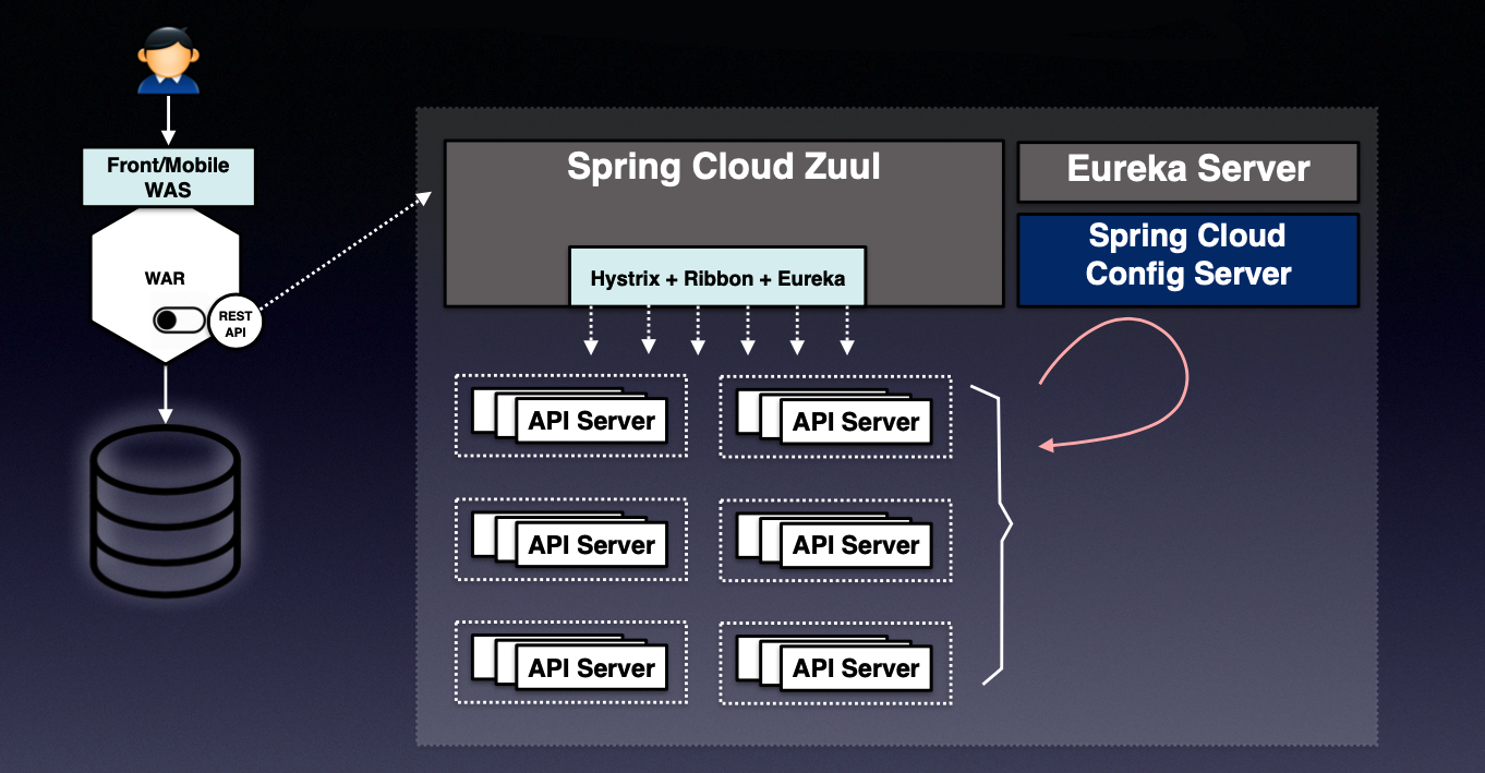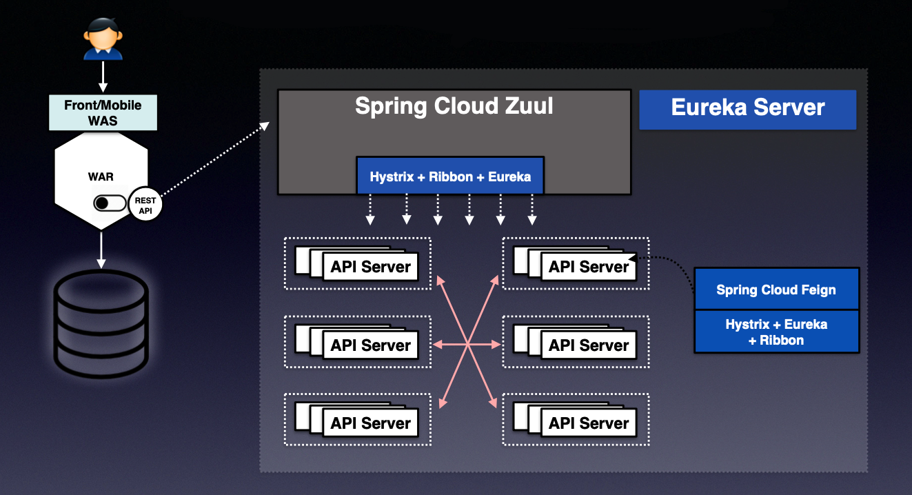 API Server들간의 호출도 Spring Cloud Feign을 통해 Hystrix + Ribbon + Eureka 조합으로 호출