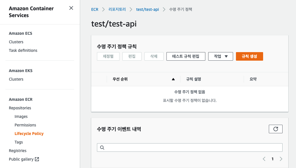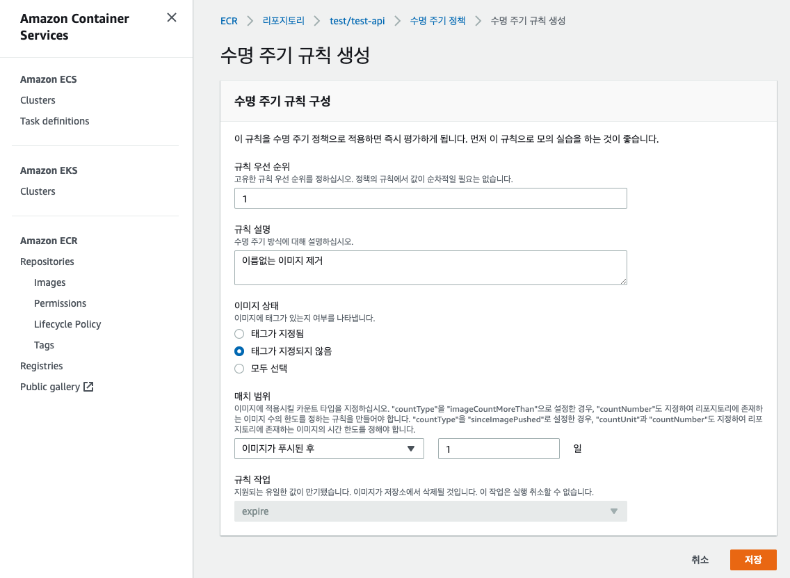 매번 새로운 Docker 이미지를 Push 할때마다 생성되는 이름없는 이미지를 제거하기 위해 수명 주기 규칙을 생성한다