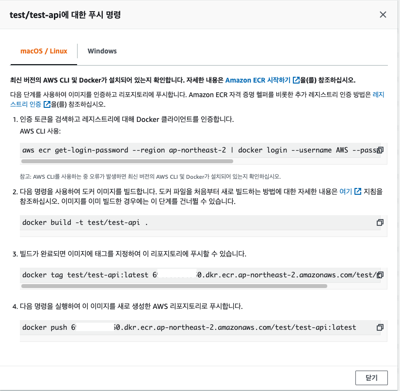 [푸시 명령 보기] 를 클릭해서 나오는 내용 안내에 따라 AWS ECR Private 로그인을 진행하고