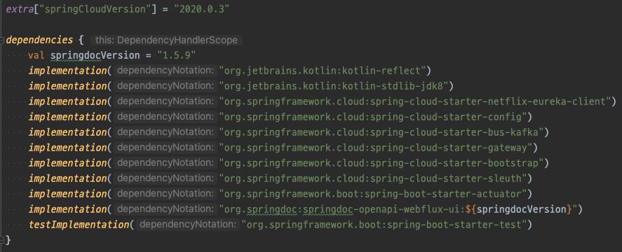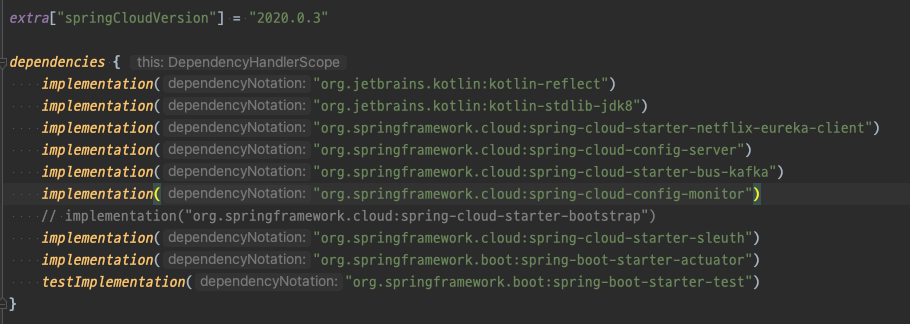 org.springframework.cloud:spring-cloud-starter-bus-kafka- Kafka 로 bus-refresh 메세지를 전송하여 Config Client 들에게 모두 변경된 설정 정보가 적용될 수 있도록 한다