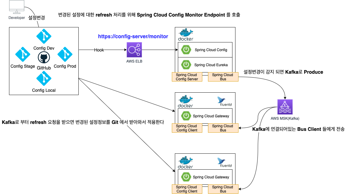 /monitorEndPoint 를 호출 - Spring Cloud Bus Kafka 가 Kafka 를 통해 Spring Cloud Config Client 들에게 refresh 메세지를 전송하여 변경된 설정사항이 적용되게 한다