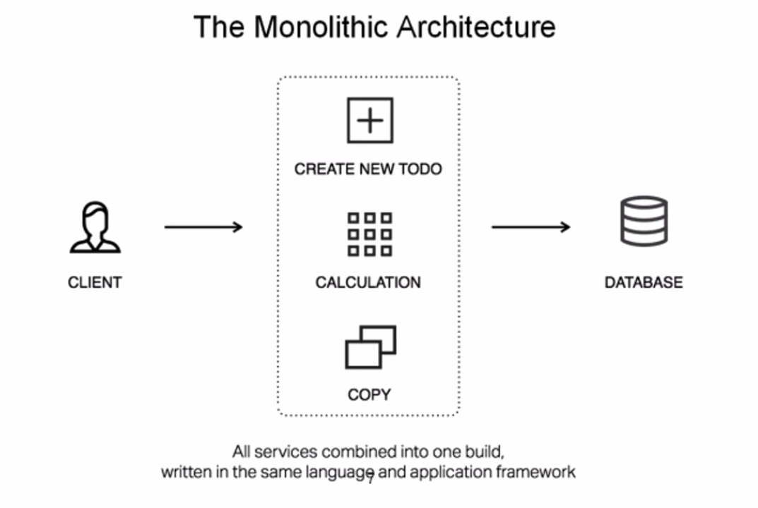 Application을 개발함에 있어 모든 요소들을 하나의 거대한 Software안에서 전부 포함시켜 개발하는 방법