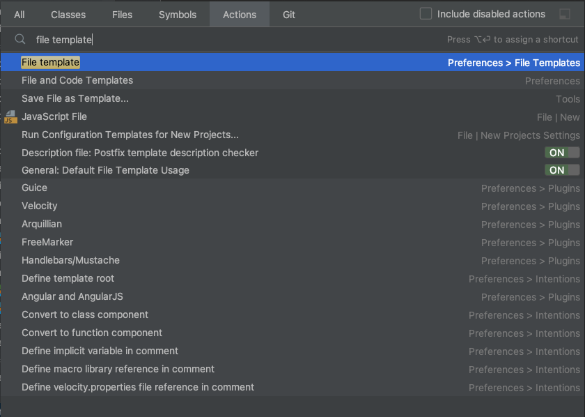 IntelliJ에서 command+shift+a 혹은 ctrl+shift+a를 눌러 action 검색창이 열린다면 아래와 같이 file template을 입력