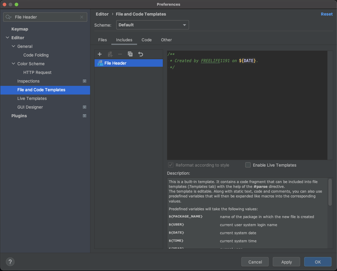 File template을 선택후 includes -> File Header를 선택하고 기본 양식의 주석 수정